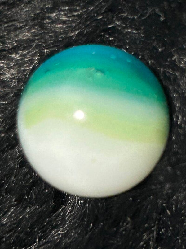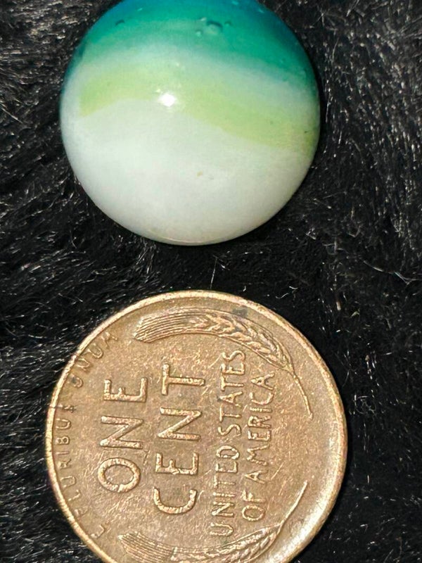 Unusual and extremely rare Aqua Blue, Green, yellow and white in translucent clear base. With Peltier signature center band of colors. These rare vibrant colors banding the center of the marble with a 9.8 mint 16mm marble