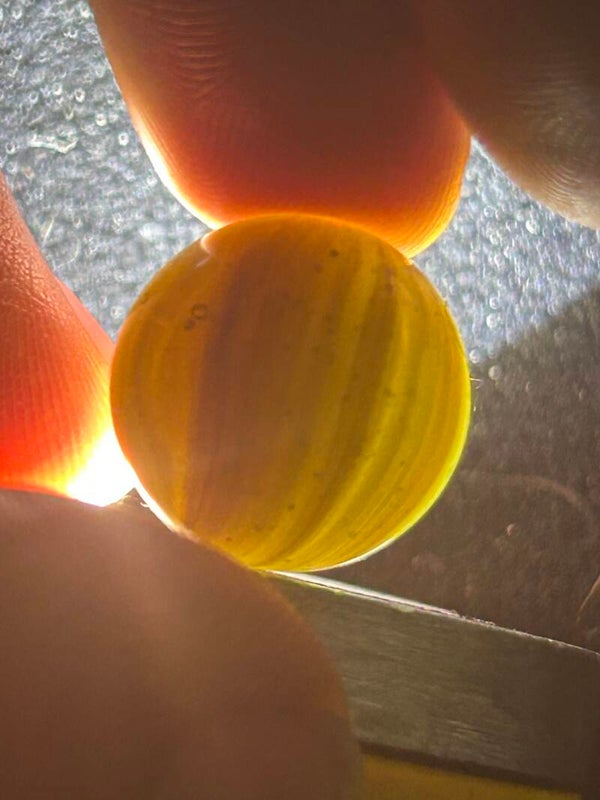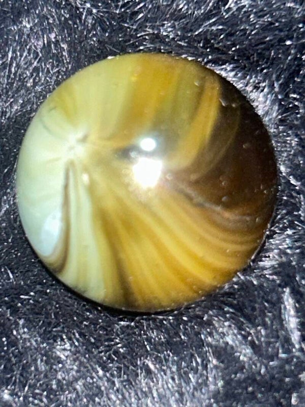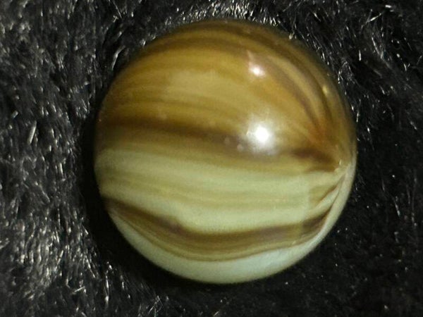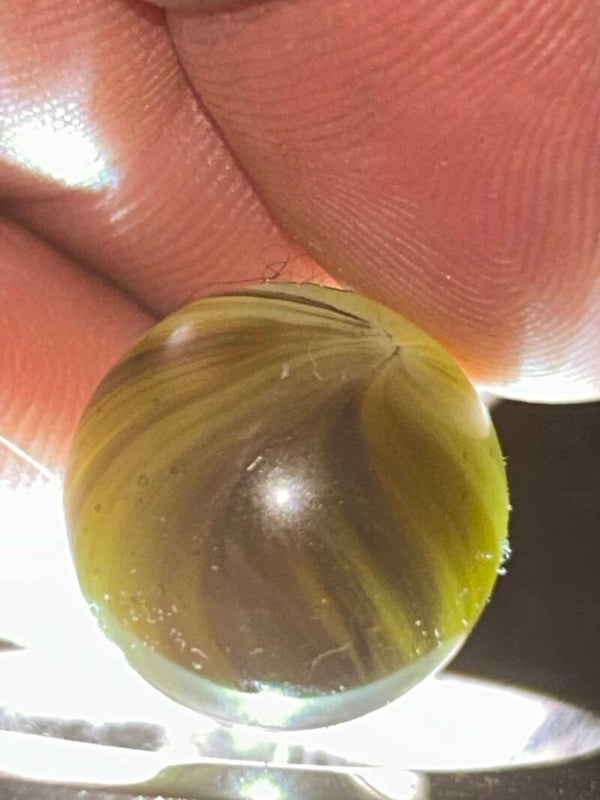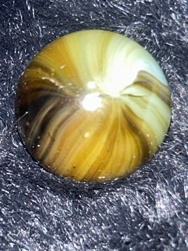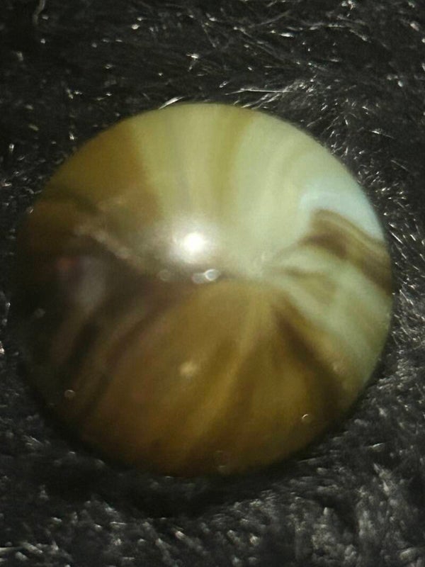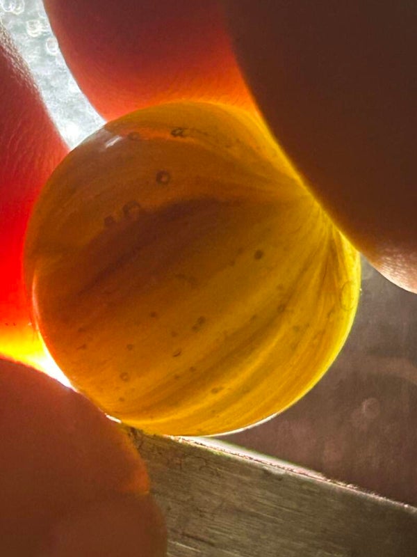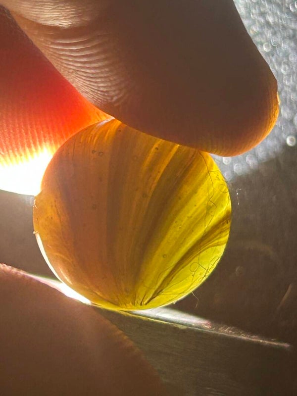 THis unique indian submarine has 85 % coverage and under a light there are black filaments within the pattern and bands . This submarine type with amber teranslucent base and oxblood. 18mm of round beauty comes in 9.7 mint condition.