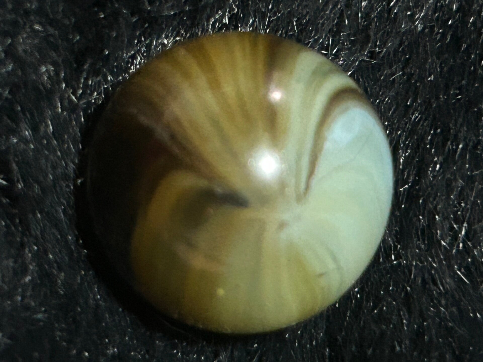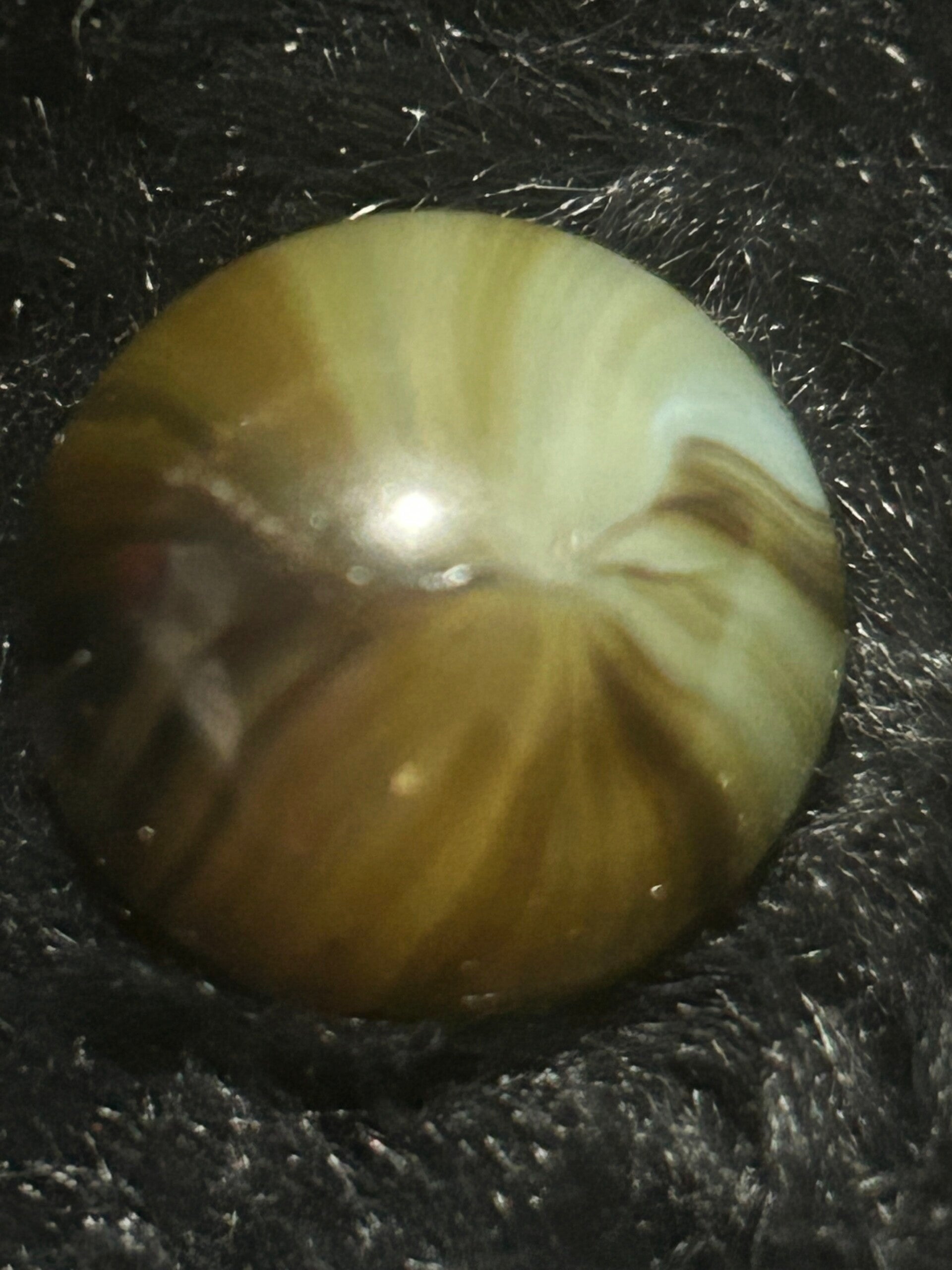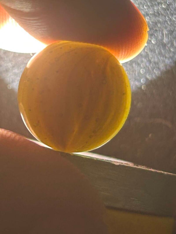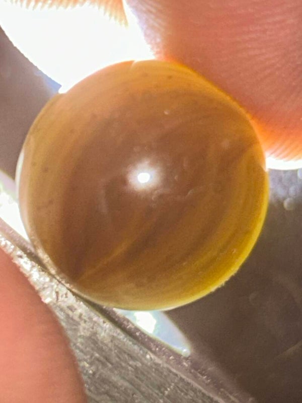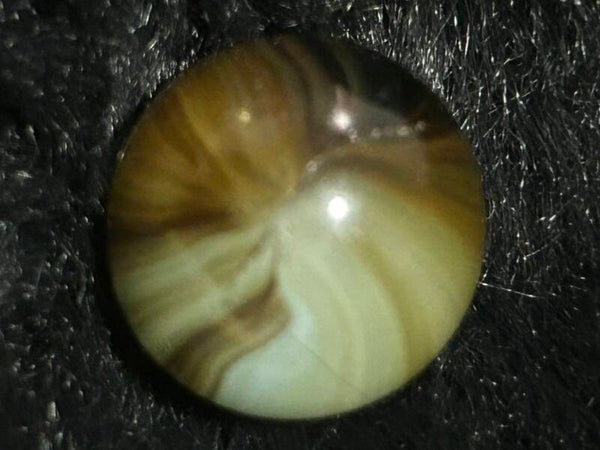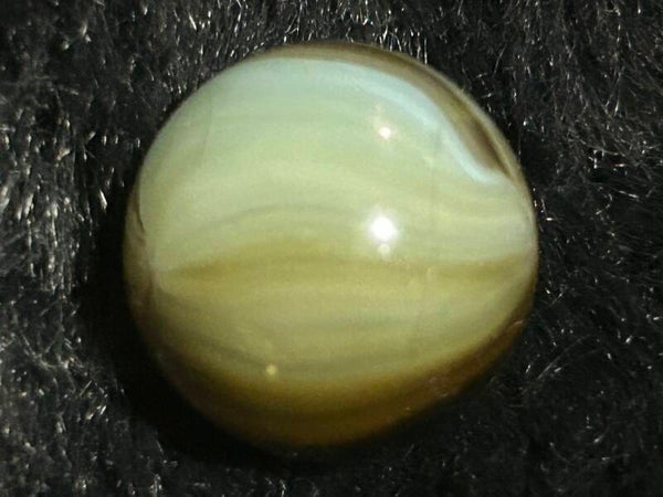THis unique indian submarine has 85 % coverage and under a light there are black filaments within the pattern and bands . This submarine type with amber teranslucent base and oxblood. 18mm of round beauty comes in 9.7 mint condition.