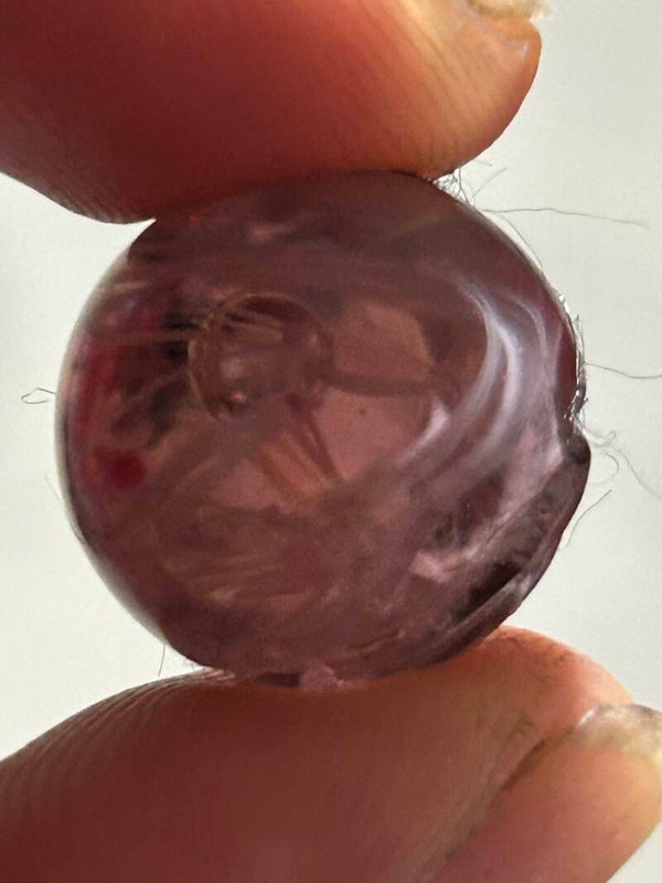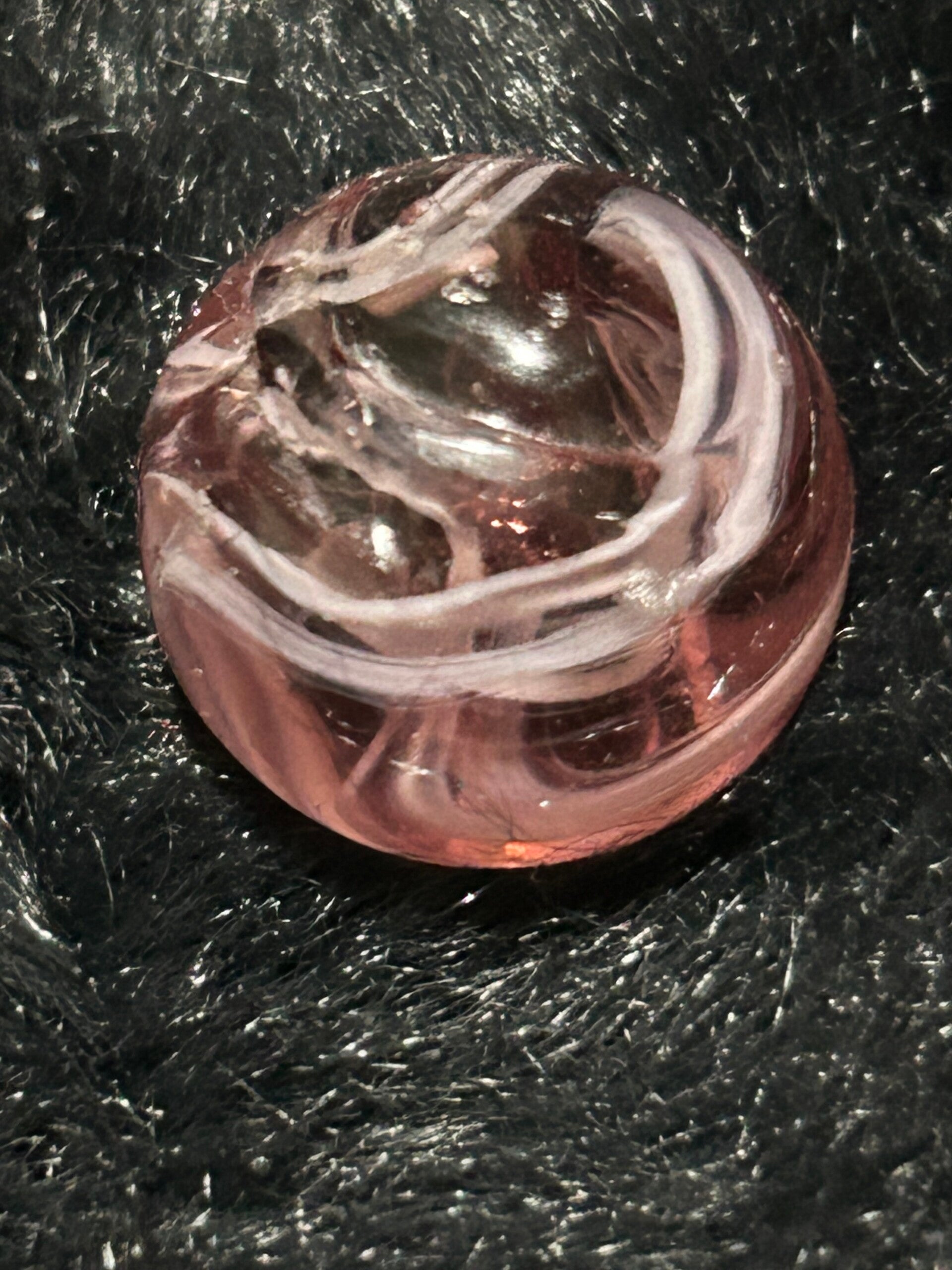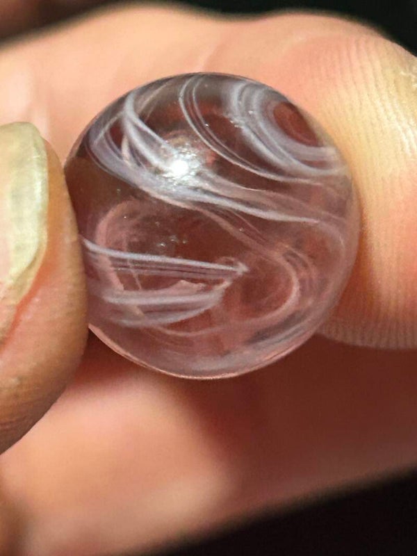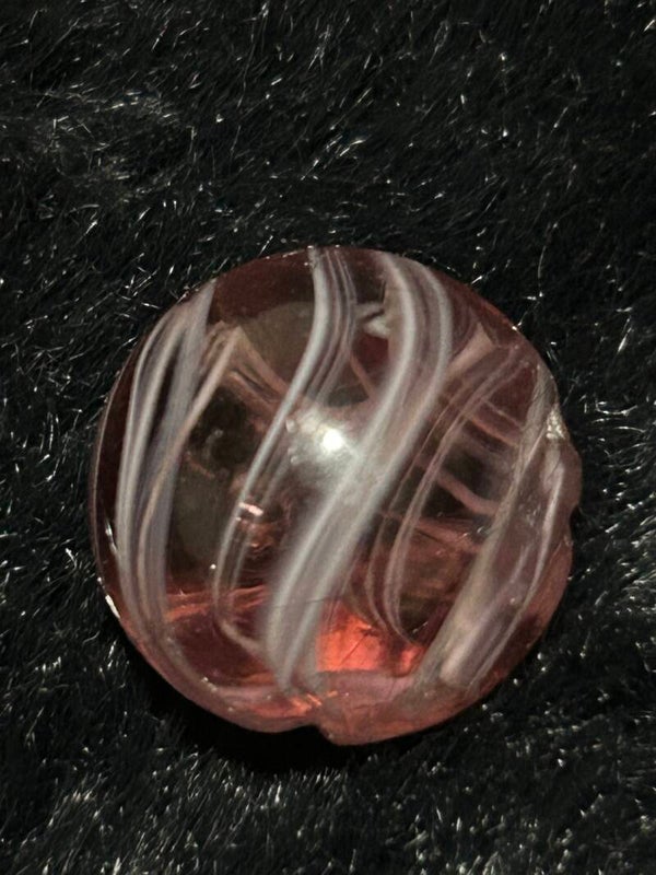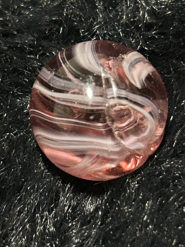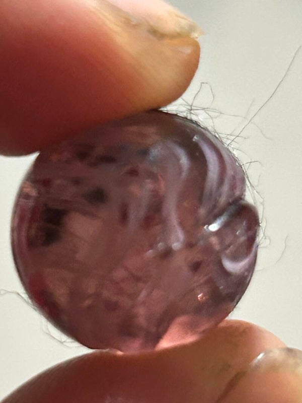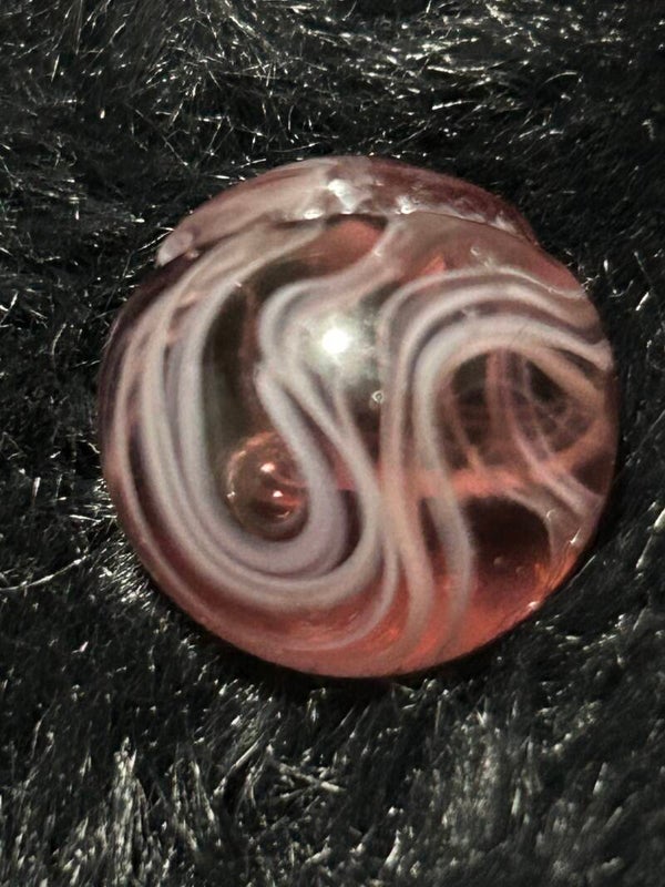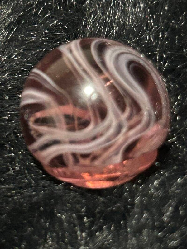 Purple transparent base with distinct white wire pull and beautiful bands. Distinct 9 signature mark for Christensen Agate. Crease Single Pontil. Odd shaped. 9.7 mint 16 mm marble